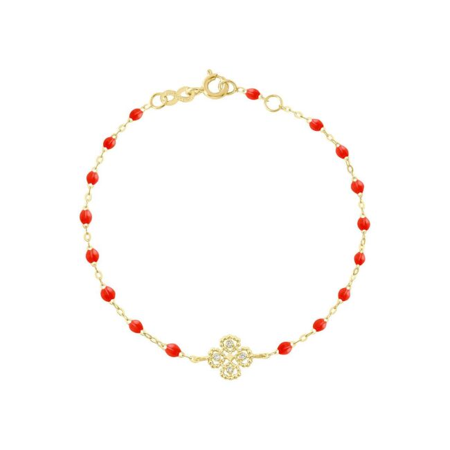 Bracelet Gigi Clozeau Lucky Trèfle en or jaune, résine corail et diamants, taille 17cm